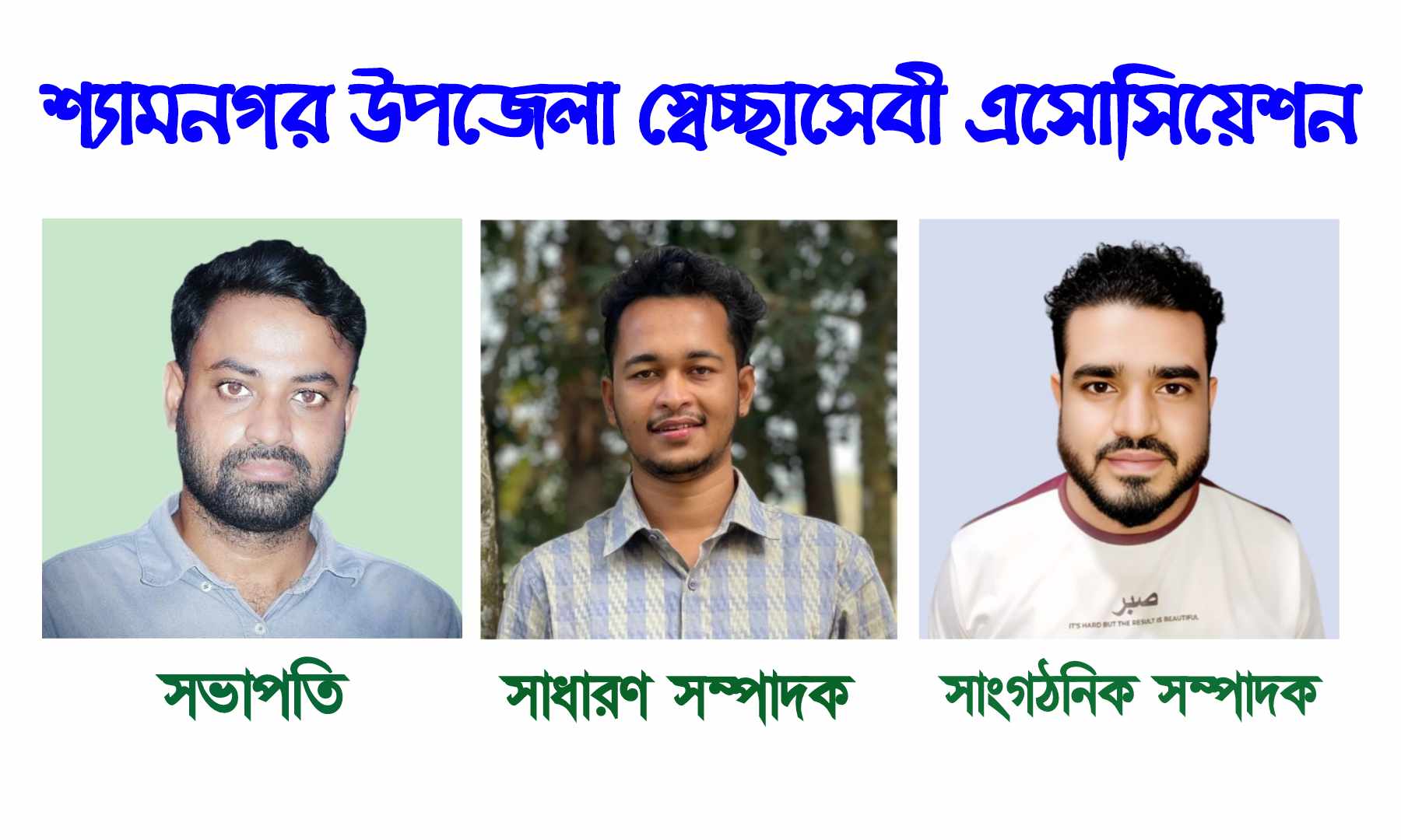 নবগঠিত কার্যকরী কমিটিতে সভাপতি হিসেবে নির্বাচিত হয়েছেন শ্যামনগর ব্লাড ব্যাংকের পরিচালক মোঃ সাইফুদ্দিন সিদ্দিক। সহ-সভাপতি পদে রয়েছেন যথাক্রমে নিরাপদ উপকূল চাই (নিউচা) এর সভাপতি মোঃ মোমিনুর রহমান, সিডিও ইয়ুথ টিম এর মোঃ হাফিজুর রহমান হাফিজ এবং শ্যামনগর অনলাইন ব্লাড ব্যাংকের পরিচালক মোঃ আব্দুল আলিম।